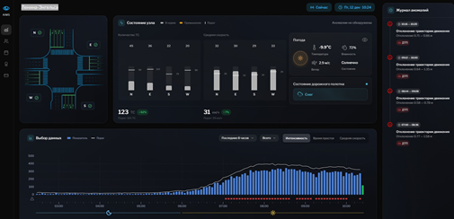5. В рамках инициативной научно-исследовательской работы «Разработка интеллектуальной системы автоматического мониторинга и анализа дорожной ситуации «AIMS ECO ROAD»» (2 этап) разработан комплекс моделей детекции и классификации аномалий: нейросетевая модель с точностью около 90%, стохастический алгоритм выявления трёх типов отклонений траекторий и вероятностная модель для определения причин инцидентов (погода, ДТП, ремонтные работы). Для визуализации и оперативной работы создан веб-сервис с микросервисной архитектурой, отображающий аномалии в реальном времени (рисунок 22). Решение базируется на системе AIMS ECO ROAD, функционал которой существенно расширен за счет внедрения 3-х новых классов алгоритмов. Модернизированная система позволяет в реальном времени анализировать транспортные потоки, сокращая время реакции на инциденты (заторы, ДТП) в 2–3 раза. Ключевой особенностью является ранжирование участков улично-дорожной сети по приоритетности уборки с точностью прогноза до 90%. Внедрение модуля динамического планирования маршрутов позволяет сократить операционные расходы на 15– 20% и повысить производительность коммунальной техники на 30% за счет исключения неэффективных выездов. Разработана и зарегистрирована программа «Модель поиска аномалий транспортного потока на основе агрегации эталонных траекторий», свидетельство № 2025692249.
